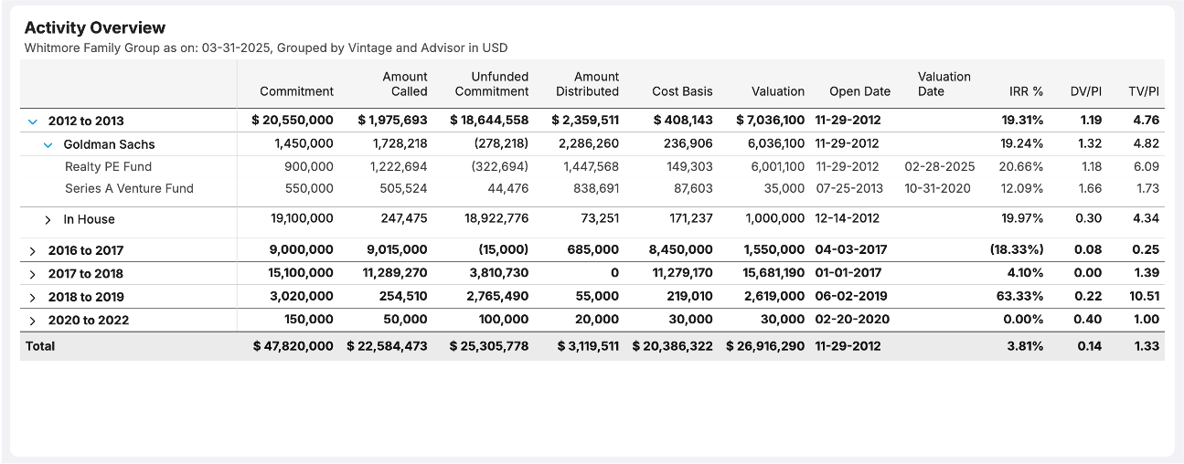 Track commitments, capital calls, distributions, and valuations for private equity, venture capital, and other illiquid holdings.