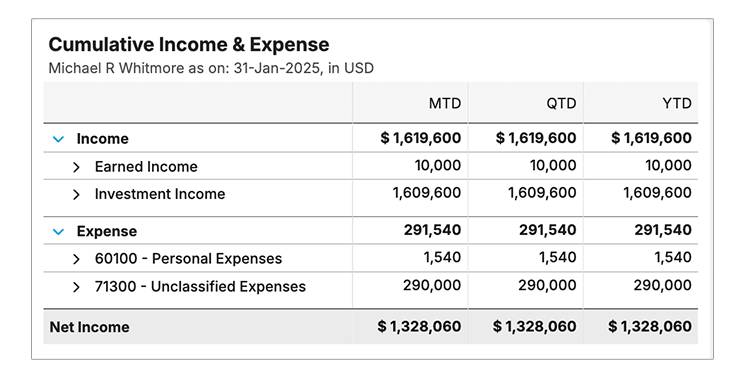 Create multiple configurable views of cumulative income and expense across entities and accounts.
